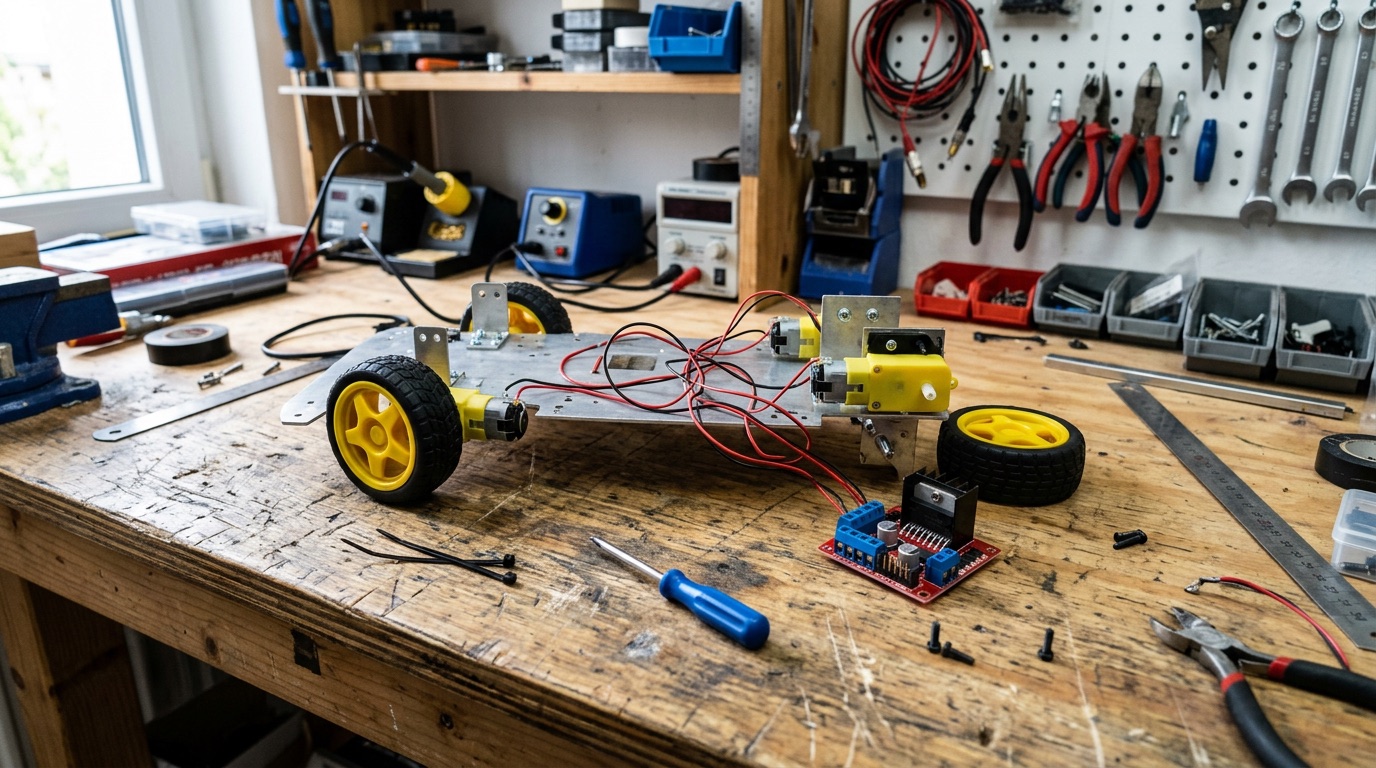 모터·드라이버·전원으로 주행 기구를 만듭니다.